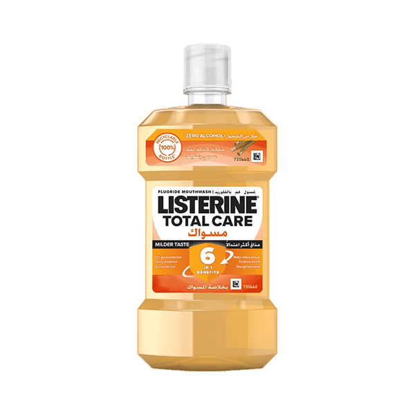 يقتل غسول الفم ليسترين توتال كير مسواك ميلدر تيست 99% من الجراثيم المتبقية بعد تنظيف الأسنان بالفرشاة بمزيج قوي من العلم ومستخلص المسواك الطبيعي. يوفر 12 ساعة من الحماية من الجراثيم ويترك فمك نقيًا ونظيفًا! استخدمه مرتين يوميًا. ليسترين توتال كير مسواك ميلدر تيست هو غسول فم خالٍ من الكحول أثبت أنه يمنحك فمًا نقيًا ونظيفًا. غني بالفلور والسيليكا ومجموعة من المركبات المضادة للميكروبات، مستخلص المسواك له قوة كبيرة. يتم الحصول على المسواك من أغصان شجرة الأراك، على الرغم من أنه يمكن أن يأتي أيضًا من أشجار الجوز والزيتون. يعتقد العديد من العلماء أن مستخلص المسواك له فوائد متعددة لأسنانك. بعض فوائد استخدام المسواك هي تقليل البلاك، والمساعدة في مكافحة أمراض اللثة، والمساعدة في منع أي تسوس أسنان موجود من التفاقم. كما أنه يحتوي على معادن مثل الكلوريد وبيكربونات الصوديوم والبوتاسيوم، التي تقوي مينا الأسنان، وتتركك في النهاية بفم صحي. يمكنك الآن الاستمتاع بمنتج ليسترين بخلاصة المسواك للاستخدام اليومي وجعله جزءًا من روتين العناية بالفم بأبسط طريقة ممكنة. نحن في ليسترين لا نلتزم فقط بمساعدتك في الحفاظ على أفضل صحة للفم ولكننا أيضًا مكرسون لحماية كوكبنا. تسعى ليسترين باستمرار إلى أن تكون أكثر مسؤولية وتساعد في تعزيز كوكب أكثر صحة. نستخدم زجاجات وأغطية قابلة لإعادة التدوير بنسبة 100%. تحتوي زجاجاتنا الجديدة الآن على 50% من البلاستيك المعاد تدويره بعد الاستهلاك. *حيث توجد المرافق؛ باستثناء ختم الأمان - 250 مل