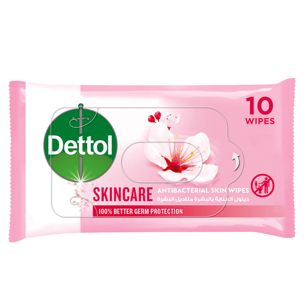 مناديل ديتول للعناية بالبشرة المضادة للبكتيريا ليست فقط لتنظيف اليدين ولكن أيضاً لحمايتك من الجراثيم المسببة للأمراض. هذه المناديل متعادلة لدرجة الحموضة وتحتوي على مرطبات لترطيب البشرة. تم اختباره من قبل أطباء الجلدية ويعطي عطر الورد وزهر الساكورا - 10 مناديل