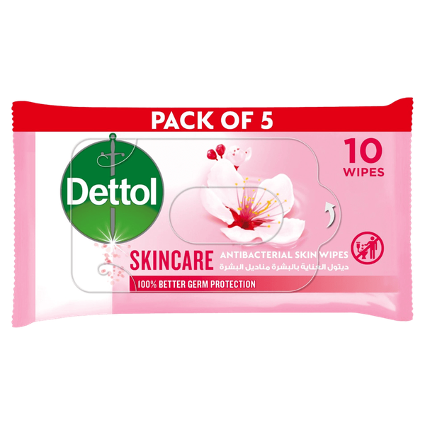 مناديل ديتول للعناية بالبشرة المضادة للبكتيريا ليست فقط لتنظيف اليدين ولكن أيضاً لحمايتك من الجراثيم المسببة للأمراض. هذه المناديل متعادلة لدرجة الحموضة وتحتوي على مرطبات لترطيب البشرة. تم اختباره من قبل أطباء الجلدية ويعطي رائحة الورد وزهر الساكورا - 5 × 10 مناديل مبللة.