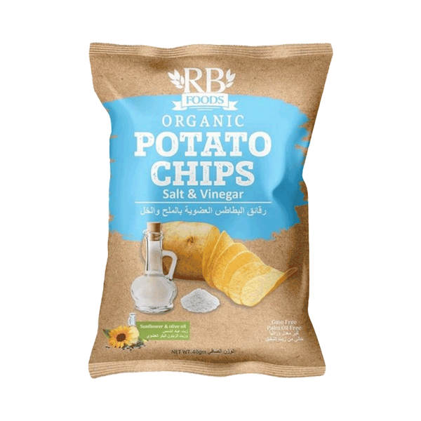 تمتع برقائق البطاطس العضوية المقرمشة بالملح والخل من آر بي فودز، محضرة مع زيت عباد الشمس وزيت الزيتون العضوي، خالية من زيت النخيل وغير معدلة وراثيا - 100 جم