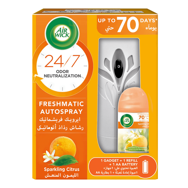 تُطلق عبوة معطر الهواء فريشماتيك أوتوسبراي القابلة لإعادة الالتعبئة من آيرويك دفعات من العطر المنعش المستمر لمدة تصل إلى 70 يوماً حتى تكون رائحة منزلك دائمًا ترحيبية. متّع حواسك بخلاصة الحمضيات المتلألئة التي تعمل على تحييد الرائحة على مدار الساعة طوال أيام الأسبوع - 250 مل