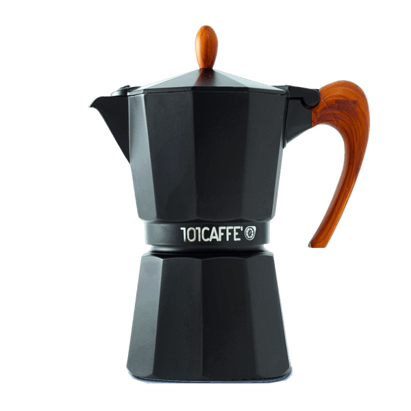 تُقدم بلمسة إضافية من الأناقة: أسود لامع، بمقبض ومقبض بنسيج خشب الكرز. مصنوع بالكامل في إيطاليا، شكله متعدد الأضلاع النموذجي يجعل من السهل ربطه وفكه مناسب لعمل الاسبريسو