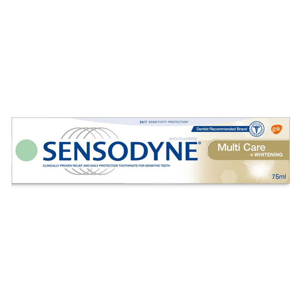 تعمل تركيبة سنسوداين عناية متعددة + تبييض الأسنان على مدار الساعة طوال أيام الأسبوع لتخفف من حساسية الأسنان. يبني حماية مهدئة حول العصب، في عمق الأسنان