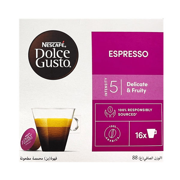 اكتشف نسكافيه دولتشي غوستو اسبريسو، قهوة محمصة خفيفة، تحتوي على كريمة كثيفة وذهبية برائحة الفواكه الرقيقة، تذكرنا بالرمان، مع نكهة الجوز المحمص - 16 كبسولة دولتشي غوستو