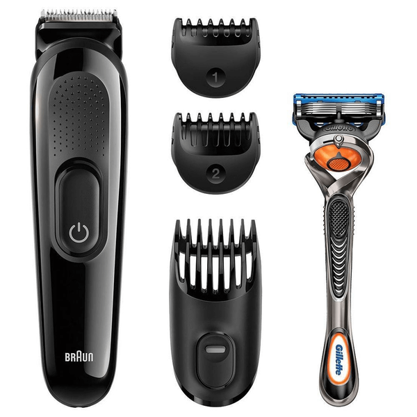 أداة تشذيب 4 في 1 للحلاقة والتشذيب والتصفيف. أربعة مرفقات متضمنة. شفرات بميزة الشحذ الذاتي. سهل التنظيف. يتضمن جهاز جيليت فيوجن 5 بور جلايد - رقم الموديل: SK3000 GP