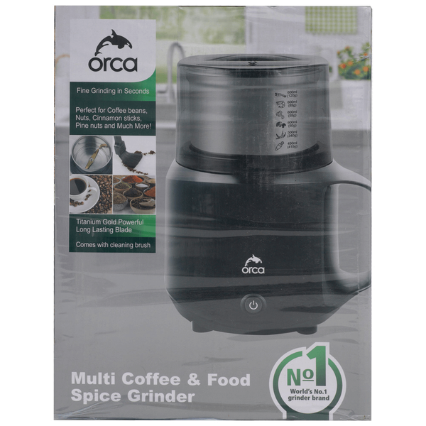 مطحنة القهوة والتوابل والمكسرات، شفرة طويلة الأمد من التيتانيوم الذهبي مع فرشاة تنظيف. طحن ناعم في ثوانٍ. القوة: 300 واط، اللون: أسود - رقم الموديل. OR-PR88