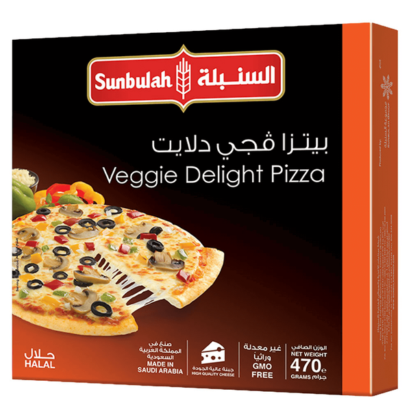 بيتزا عالية الجودة تتكون من الفطر، البصل، شرائح الفلفل الأخضر، الأحمر، الأصفر، الزيتون الأسود بالإضافة الى جبن بمذاق لذيذ وفريد - 470 جم