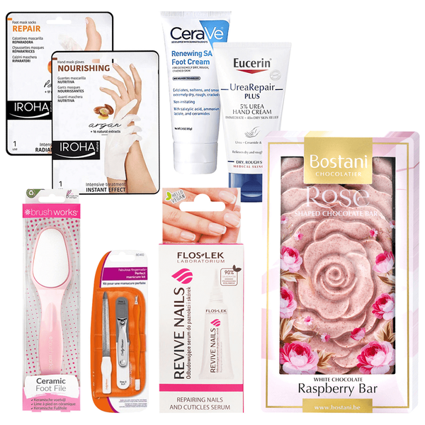 تتضمن المجموعة: كريم القدم من سيرافي كريم باليوريا 5% لليدين من يوسيرين مجموعة تقليم الأظافر أداة تنعيم للقدم من برش سيروم لإصلاح الأظافر والجلد من فلوسليك ماسك للعناية بالاظافر من إيروها شوكولاتة بالتوت البري - 100 جم