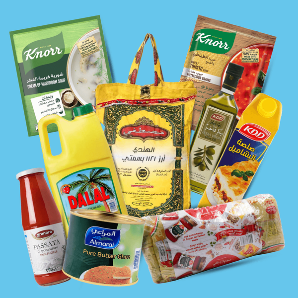 تتضمن المجموعة: زيت النخيل من دلال أرز بسمتي هندي من مصطفى - كبير جداً شوربة الطماطم والقمح من كنور شوربة الفطر من كنور زيت زيتون من كي دي دي سمن الزبدة من المراعي معكرونة من العلالي صلصة من جرانورو صلصة البشاميل من كي دي دي كركم ناعم من مجدي