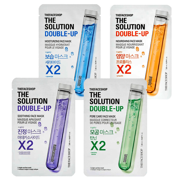 تتضمن المجموعة: ماسك الوجه المهدئ بمحلول المضاعف - 20 مل ماسك الوجه لعناية المسام بمحلول المضاعف - 20 مل ماسك الوجه مرطب ذا سلوشن - 20 مل ماسك للوجه مغذي ذا سولوشن - 20 مل