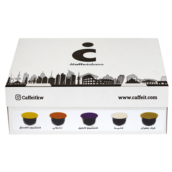 علبة مليئة بنكهات كبسولات القهوة اللذيذة التي تحتوي على نكهة الكرك بالزعفران ولاتيه بالبندق والجينسنغ وكابتشينو بالكراميل - 40 كبسولة