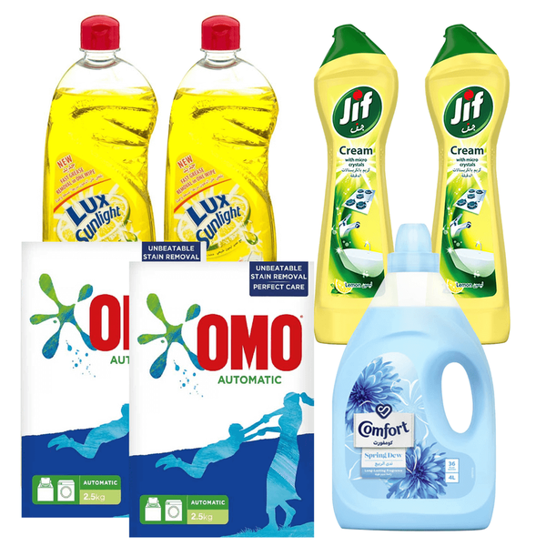 تتضمن المجموعة: 1 × منعم أقمشة ندى الربيع من كومفروت 2 × كريم منظف برائحة الليمون من جف 2 × مسحوق الغسيل من أومو 2 × سائل غسيل الصحون سنلايت برائحة الليمون من لاكس