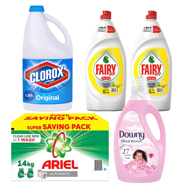 تتضمن المجموعة: مسحوق الغسيل الأخضر للغسالات الأوتوماتيكية من آريال - 2 × 7 كجم سائل مبيض من كلوركس - 1.89 لتر غسول الأطباق برائحة الليمون من فيري - 2 × 800 مل منعّم الأقمشة المركز برائحة نسيم الزهور من داوني - 3 لتر