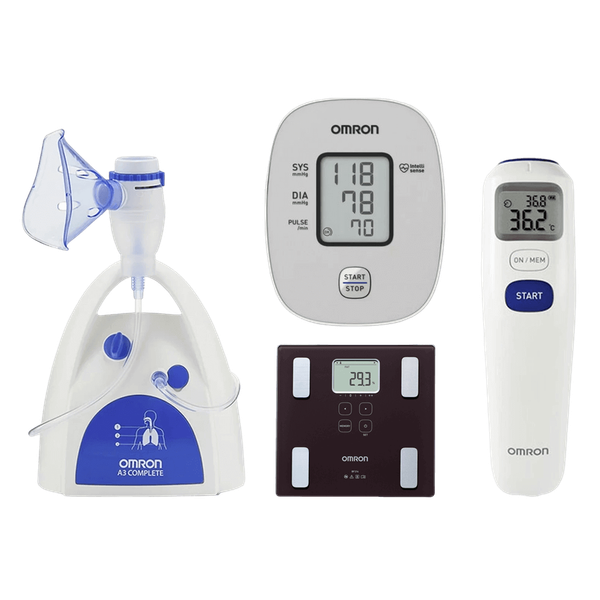 تحتوي المجموعة على: جهاز إستنشاق + جهاز مراقبة ضغط الدم + ميزان لقياس الوزن + ميزان لقياس حرارة الجبهة