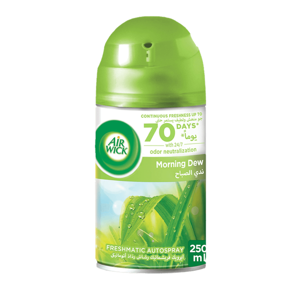 تُطلق عبوة إعادة التعبئة معطر الهواء فريشماتيك التلقائي من آيرويك دفعات من العطر المنعش المستمر لمدة تصل إلى 70 يوماً، لذلك تنبعث رائحة منزلك دائمًا من الترحيب. متع حواسك بخلاصة ندى الصباح الذي يحيد الرائحة طوال الإسبوع - 250 مل