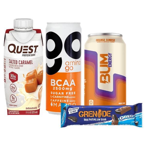 تتضمن المجموعة: مخفوق البروتين بنكهة الكراميل المملح من كويست (325 مل) - مشروب الطاقة من سلسلة كريس بامستيد بنكهة البرتقال من رو (355 مل) - مشروب بنكهة المانجا من أمينو جو (330 مل) - لوح البروتين بالاوريو من جرينيد (60 جم)