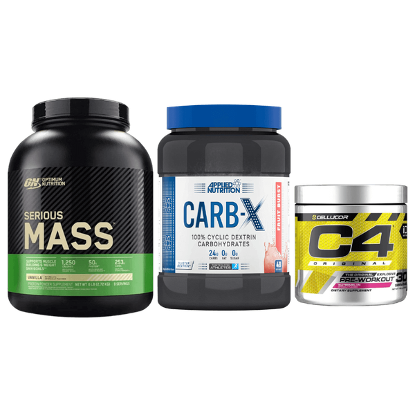 تتضمن المجموعة: مسحوق البروتين بالفانيليا من أوبتيمم نيوترشن (2.27 كجم) - مكمل كاربوهايدرات كارب-إكس بنكهة الفواكه من أبلايد نيوترشن (1.2 كجم) - مسحوق سي 4 لما قبل التمرين بنكهة البطيخ من سيلوكور (195 جم)