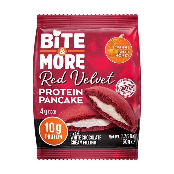 بانكيك البروتين بنكهة الريد فيلفيت مع حشوة كريمة الشوكولاتة البيضاء المحلاة بالعسل. يحتوي على 10 جرام بروتين، و4 جرام ألياف - 50 جم