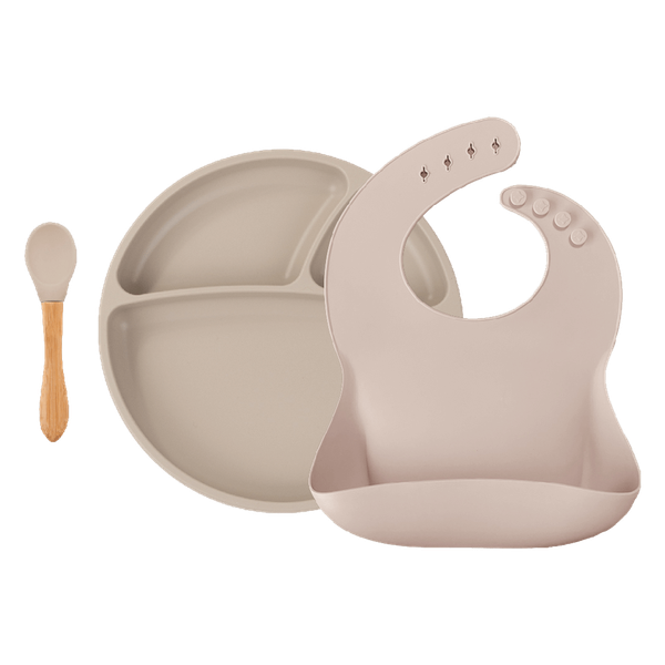 تتضمن المجموعة: مريلة سيليكون - طبق سيليكون 3 أقسام - ملعقة سيليكون