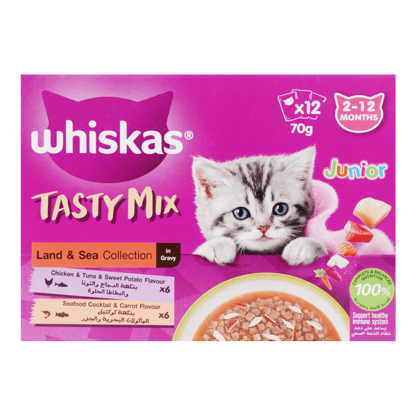يمنح مزيجاً من النكهات البرية والبحرية في مرق لذيذ. مصمم لتلبية تفضيلات القطط البالغة، حيث يوفر تغذية متوازنة مع مجموعة متنوعة من البروتينات للحفاظ على صحة قطتك - 12 × 70 جم