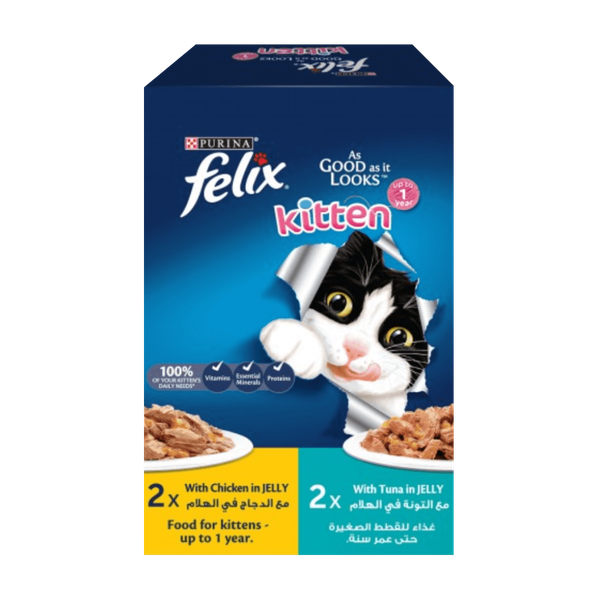 تم تركيبه خصيصاً للقطط الصغيرة النامية. يحتوي على دجاج وتونة طريين في هلام لذيذ، مما يوفر وجبة متوازنة ومغذية تدعم النمو والتطور الصحي. هذا الطعام الرطب غني بالبروتينات والفيتامينات والمعادن الأساسية لصحة القطط بشكل عام، مما يضمن حصولها على أفضل بداية في الحياة - 4 قطع