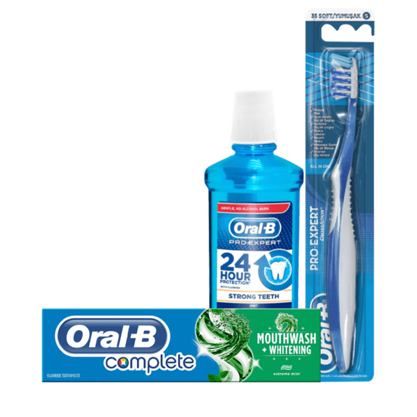 تتضمن المجموعة: معجون أسنان متكامل + مبيض قوي بالنعناع من أورال-بي (100 جم) - فرشاة برو-اكسبرت اكسترا كلين من أورال-بي (فرشاة أسنان ناعمة) - غسول الفم برو-إكسبرت سترونج تيث بالنعناع من أورال-بي (500 جم) - مجموعة من 3