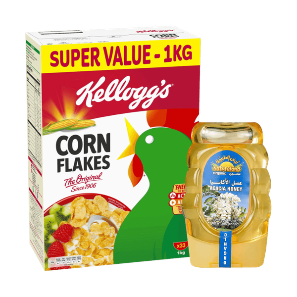 تتضمن المجموعة: رقائق الذرة من كيلوجز (1 كجم) - عسل أكاسيا العضوي من أرض الطبيعة (360 جم) - مجموعة من 2