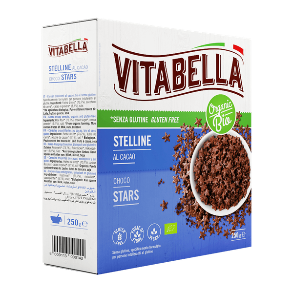 حبوب إفطار عضوية خالية من الغلوتين. هذه الحبوب على شكل نجمة مصنوعة من مكونات عضوية، بما في ذلك الذرة والأرز، ومغطاة بالكاكاو الغني. إنها خالية من الألوان والنكهات والمواد الحافظة الصناعية، مما يوفر خيارًا طبيعيًا ولذيذًا للإفطار أو الوجبات الخفيفة - 250 جم