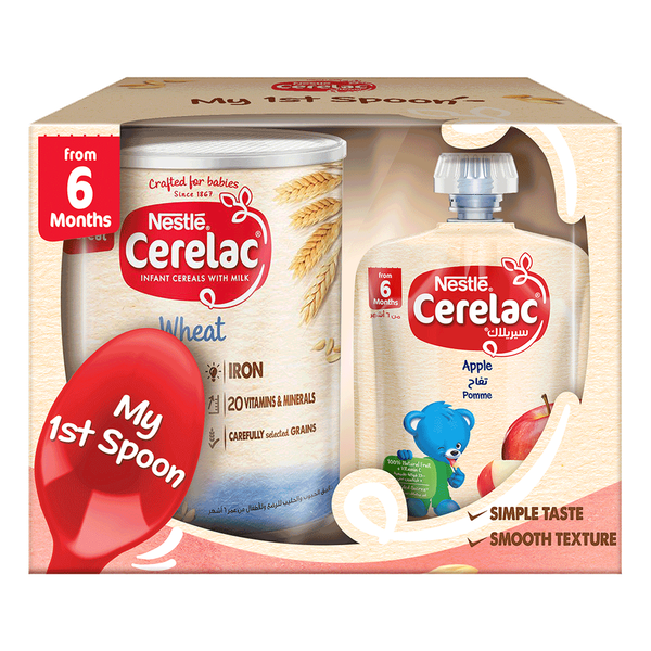 حبوب إفطار مدعمة للأطفال مصنوعة من القمح والحليب، وخالية من السكريات المضافة، ومصممة لتوفير العناصر الغذائية الأساسية للأطفال من سن 6 أشهر. غنية بالحديد والكالسيوم والفيتامينات لدعم النمو الصحي، بالإضافة إلى كيس مجاني من هريس فاكهة التفاح لمزيد من التنوع - 90 جم