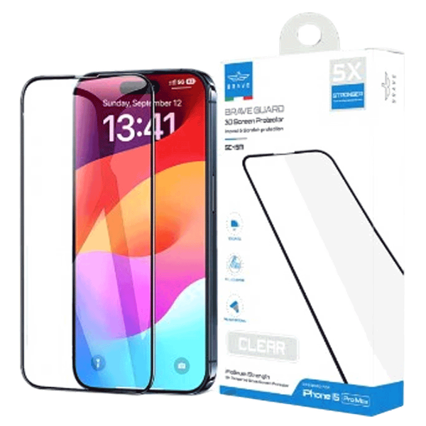 حامي شاشة Brave Guard لهاتف iPhone 15 Pro Max شفاف يقدم تغطية متينة مقاومة للكسر مع وضوح عالي الجودة ولمس سلس