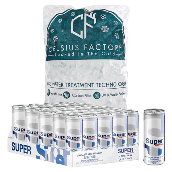 المجموعة تحتوي على: سوبر بدون سكر (24 × 250 مل) - مكعبات ثلج (4 كجم)