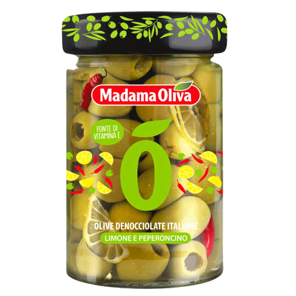 زيتون أخضر يوناني منزوع النواة ومتبل بالليمون والفلفل الحار، بطعم منعش مع لمسة حارة خفيفة. مثالي لأطباق المقبلات والوصفات المتوسطية - 140 جم
