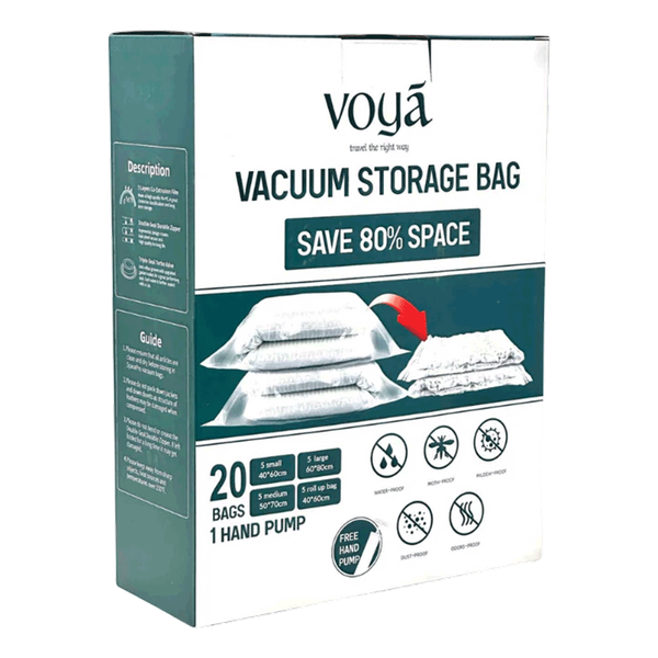 أكياس تخزين مصنوعة من فيلم عالي الجودة بسبع طبقات من البولي أميد والبولي إيثيلين وتحتوي على سحاب مزدوج محكم الإغلاق وصمام توربو ثلاثي الإحكام لضمان بقاء الهواء خارج الأكياس وحماية المحتويات وتأتي مع مضخة يدوية 5 أكياس بمقاس 40 × 60 سم 5 أكياس بمقاس 50 × 70 سم 5 أكياس بمقاس 60 × 80 سم 5 أكياس قابلة للطي بمقاس 40 × 60 سم