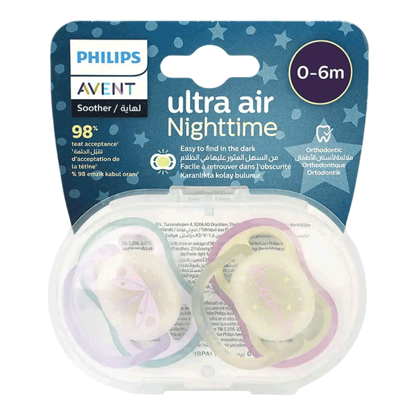 مصممة لتهدئة طفلك وراحته مع ضمان تدفق الهواء الأمثل للبشرة الحساسة. تتميز هذه المصاصة بتصميم فريد مع فتحات تهوية كبيرة تسمح للجلد بالتنفس، مما يحافظ على برودته وجفافه. بفضل المقبض المتوهج، يسهل العثور على المصاصة في الظلام - 2 قطعة