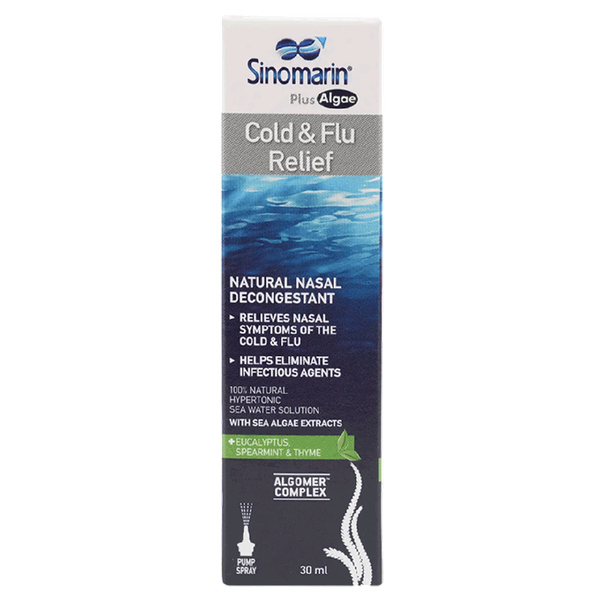 بخاخ أنفي طبيعي 100٪ يحتوي على ماء بحر عالي التركيز (2.3٪ كلوريد الصوديوم)، وزيت الأوكالبتوس، والنعناع، والزعتر، والجلسرين لتخفيف أعراض البرد والإنفلونزا الأنفية، وإزالة الاحتقان، وترطيب الأنف - 30 مل
