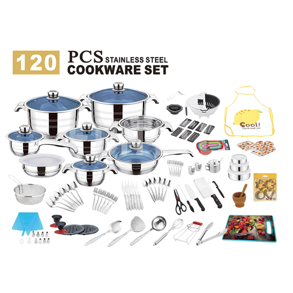 تتضمن المجموعة 6 قدور ستانلس ستيل مع أغطية زجاجية مقسّاة، قدر صلصة واحد مع غطاء، قدر شوربة واسع واحد مع غطاء، سلة قلي واحدة بمقبض قابل للفصل، وعاء تبخير واحد، أداة كيك واحدة، 12 قالب بسكويت، 3 ملاعق مطبخ، مضرب بيض واحد، ملقط معجون واحد، ملقط طعام واحد، مريلة واحدة، 3 قفازات مقاومة للحرارة، لوح تقطيع واحد، 12 قطّاعة خضار، 6 سكاكين، مدق كيك واحد، مجموعة ملاعق قياس (6 قطع)، مجموعة أوعية حفظ واحد، 4 علب بودرة، 2 كوب سكر، و30 قطعة أدوات مائدة ستانلس ستيل، مع خامات عالية الجودة وأغطية زجاجية متوافقة مع مواقد الغاز والحث الحراري ومقابض مريحة وسهولة التنظيف - 120 حبة