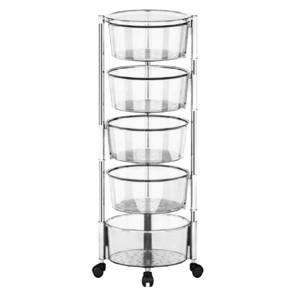 مصنوع من مادة PET المتينة مع دعامات من الفولاذ المقاوم للتآكل، ويتميز برفوف قابلة للدوران وسلال مجوّفة قابلة للإزالة، إضافة إلى عجلات ABS هادئة وسلسة للحركة. بتصميم أنيق وشفاف من 4 طبقات - 5 رفوف
