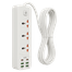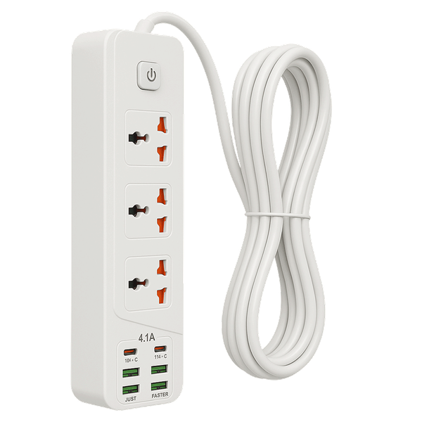 لوحة تمديد بثلاثة مقابس مع 4 منافذ USB ومنفذين لشحن سريع Type-C. تتميز بإخراج 4.1 أمبير، ومفتاح تشغيل/إيقاف، وسلك طويل ومتين، مثالية لتشغيل وشحن الأجهزة الإلكترونية في المنزل والمكتب بكفاءة