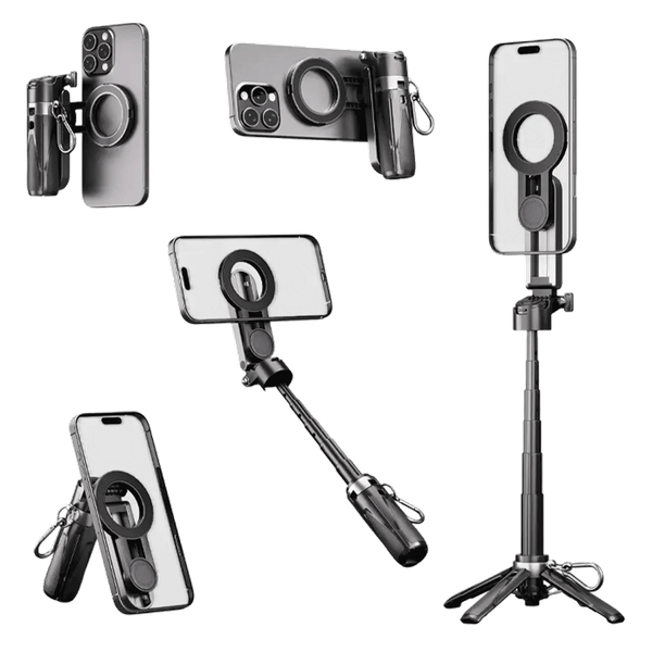 يتحول بسهولة إلى عصا سيلفي، أو مقبض، أو حامل ثلاثي القوائم مثالي لتصوير الفيديوهات، والبث المباشر، أو الصور الجماعية. تحافظ المغناطيسات القوية على هاتفك آمنًا، بينما يتيح لك بلوتوث 5.2 التصوير بدون استخدام اليدين.