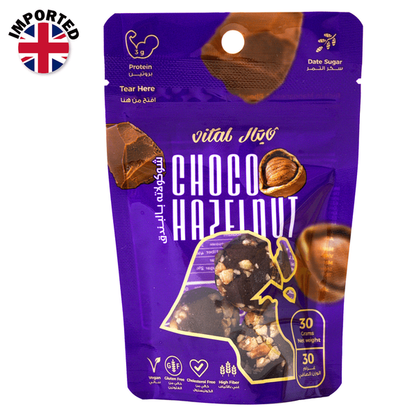 Heavenly combination between Saudi Arabian dates, belgian dark chocolate and cacao powder covered with Turkish hazelnuts. You will enjoy a wonderful taste that supports your body with manganese and phosphorus - Pack 1 x 70 gm