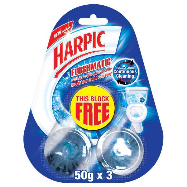 Harpic Flushmatic In-Cistern Toilet Cleaner helps you prevent the build-up of stains giving you a continuous clean toilet. A single block lasts approximately up to a month and makes you experience a fresh pine fragrance with every flush - 3 x 50 gm