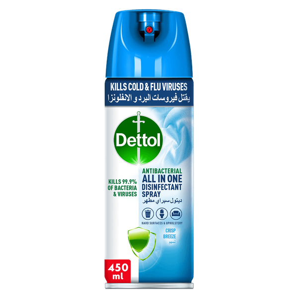 Protect your family from cold and flu with Dettol Antibacterial Disinfectant Spray! Kills a wide range of bacteria, viruses and fungi. Sanitizes, disinfects and deodorizes with a fresh dew fragrance. Easy to use on various surfaces - 450 ml