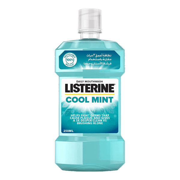 Clinically proven to provide three times deeper clean than brushing alone, Listerine Cool Mint Mouthwash kills 99% of germs that cause plaque and bad breath when used twice daily. Its formula acts in areas that a toothbrush cannot reach by killing bacteria in between the teeth. Listerine Cool Mint Mouthwash reduces dental plaque and freshens breath. It offers fresh breath protection and has a refreshing cool mint flavor. Transform your oral care routine by using Listerine Cool Mint Mouthwash twice daily! We at Listerine are not only committed to helping you maintain the best oral health but also dedicated to protecting our planet. Listerine continuously strives to be more responsible and help promote a healthier planet. We use 100% recyclable bottles and caps. Our new bottles now contain 50% post-consumer recycled plastic. *Where facilities exist; safety seal excluded - 250 ml