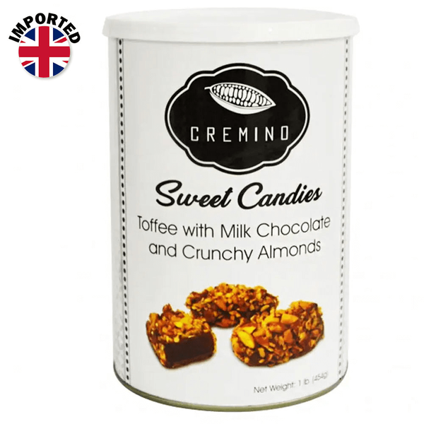 Toffee with milk chocolate and crunchy almonds from Cremino. Delicious toffee dessert covered with delicious milk chocolate and crunchy almond pieces - 454 gm