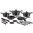 Eco friendly and easy to clean cookware set, made with forged aluminum Pan 20 x 4.5 cm Deep pan 24 x 6.8 cm Casserole with lid 20 x 10 cm, 24 x 12 cm, 28 x 12.5 cm Spoon, turner, whisk & soup ladle 3 kitchen knives 2 hot plates Model No. GBH048-2