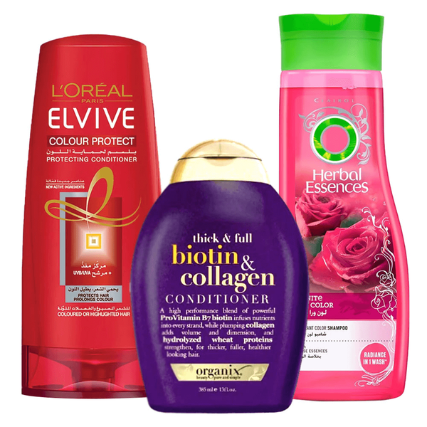 Set Includes: Herbal Essences Ignite My Color Shampoo With Rose Essences - 400 ml L'Oreal Elvive Color Protect Conditioner - 400 ml Ogx Biotin & Collagen Conditioner - 385 ml