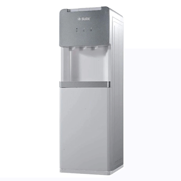 Water dispenser with three spouts suitable for hot, cold or room-temperature water with a child safety lock. Has a pre-set thermostat for hot water and adjustable thermostat with cold water. Material: Stainless steel - Grey. Model No. SURESF1960WP