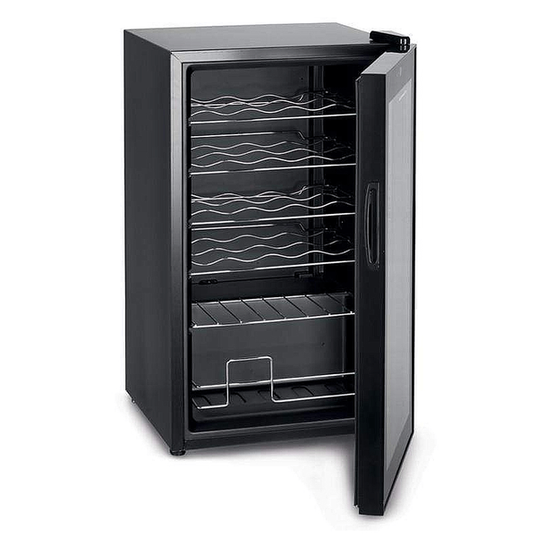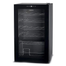 Beverage cooler with metal shelves, a glass door and interior lights. Temperature zone 15-18 degrees. Dimensions: 430 x 450 x 740 mm. Model No. BCM24.000BK