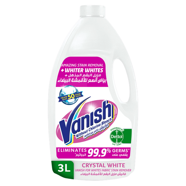 Vanish Crystal White Fabric Stain Remover Detergent for Whites removes even tough dried-in stains gently from your everyday white fabrics. It gives you whiter whites even after 50 washes. It also gives a boost of pleasant scent to your fabrics - 3 L