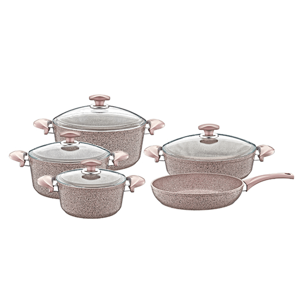 Aluminum design. 4 Layers of Granite non-stick coating, durable to high temperatures, dishwasher safe. Made in Turkey. It contains: casserole with cover 20 cm, 24 cm, 28 cm, low casserole with cover 28 cm and frying pan 26 cm - Brown